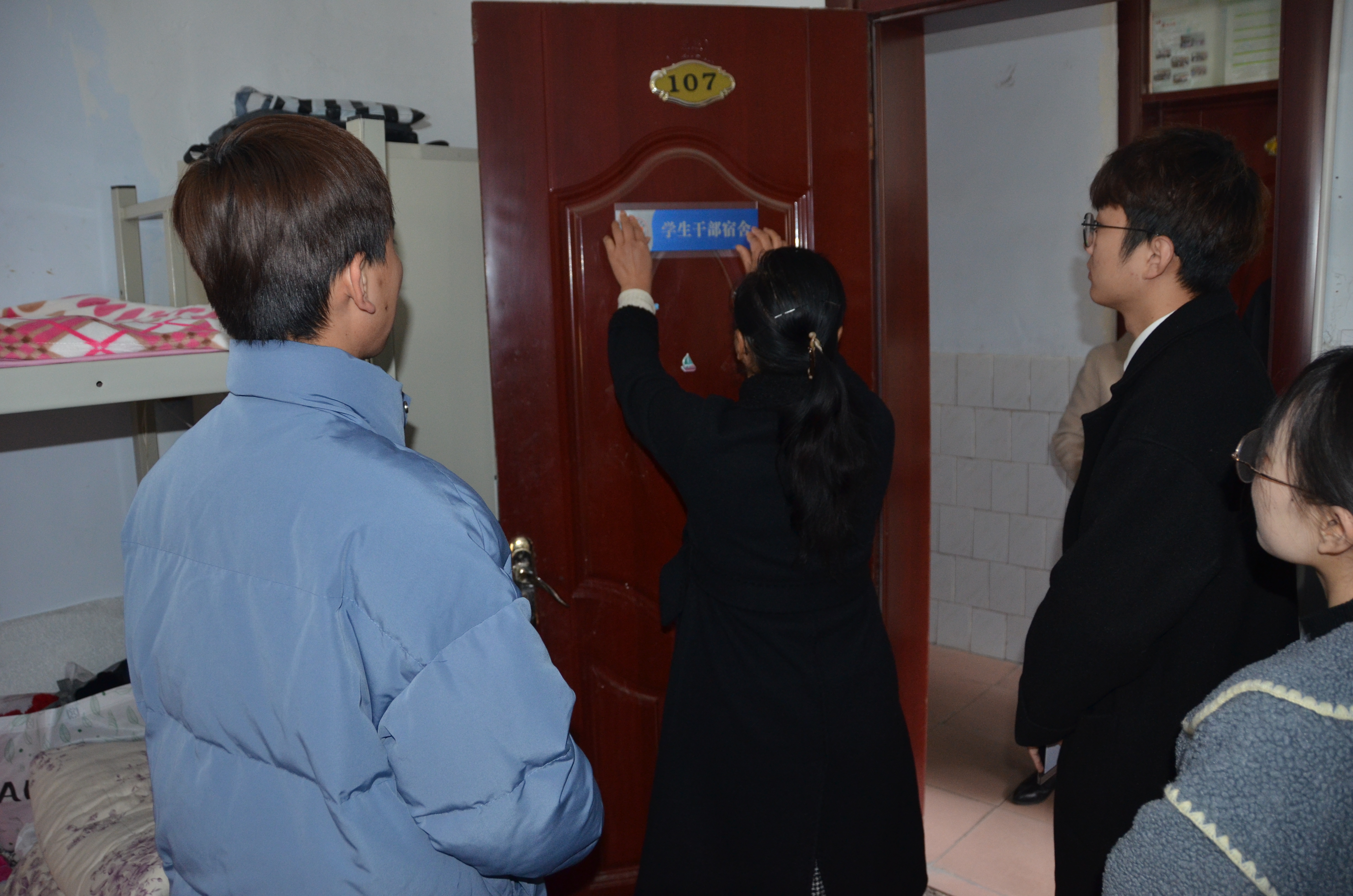会后,刘瑛和郭家瑞前往学生党员、学生干部宿舍慰问,询问了他们的工作、学习、生活情况,为宿舍挂上学生党员,干部门牌。希望他们继续以饱满热情的态度服务每一位同学,为同学们做表率。