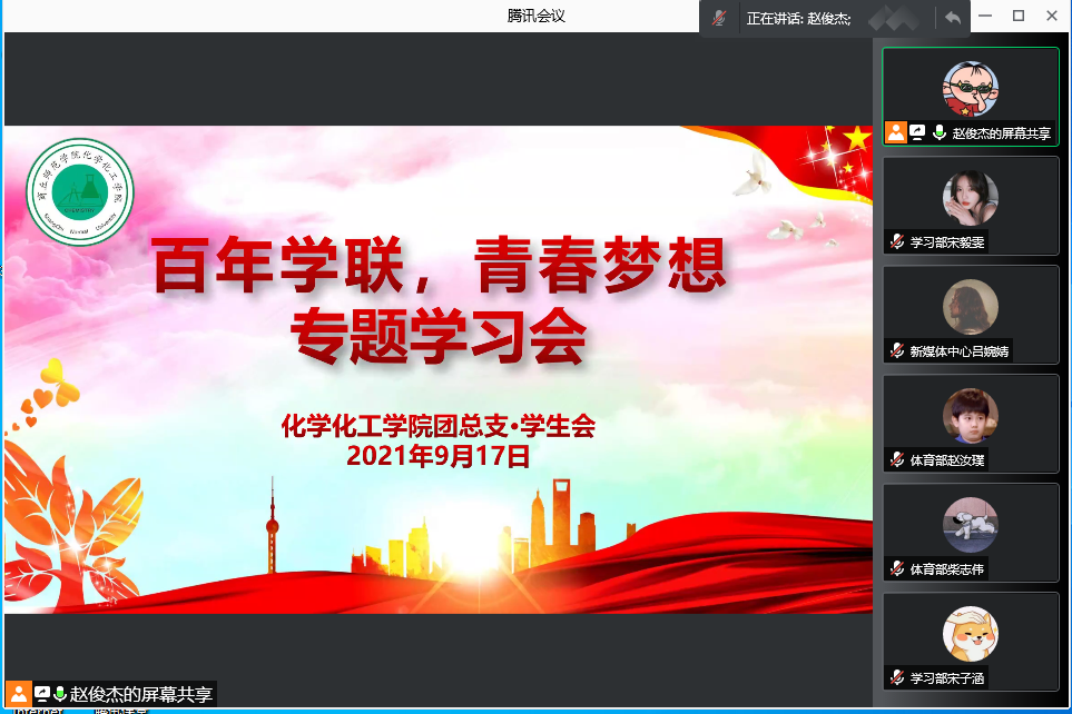 会议第二项,学习习近平总书记重要讲话精神,赵俊杰从学习习近平总书记在庆祝中国共产党成立100周年大会上的讲话、学习习近平总书记致全国青联十三届全委会和全国学联第二十七次代表大会的贺信和党中央致词、学习习近平总书记关于青少年学生成长的重要要求摘录三方面带领大家进行学习。随后开展“百年学联,青春梦想”专题学习,赵俊杰从学习学联历史,以史为鉴、学习学联历史,知史明理、学习学联历史,接力奋进、学习学联历史,攻坚克难四个方面带领大家进行学习。
