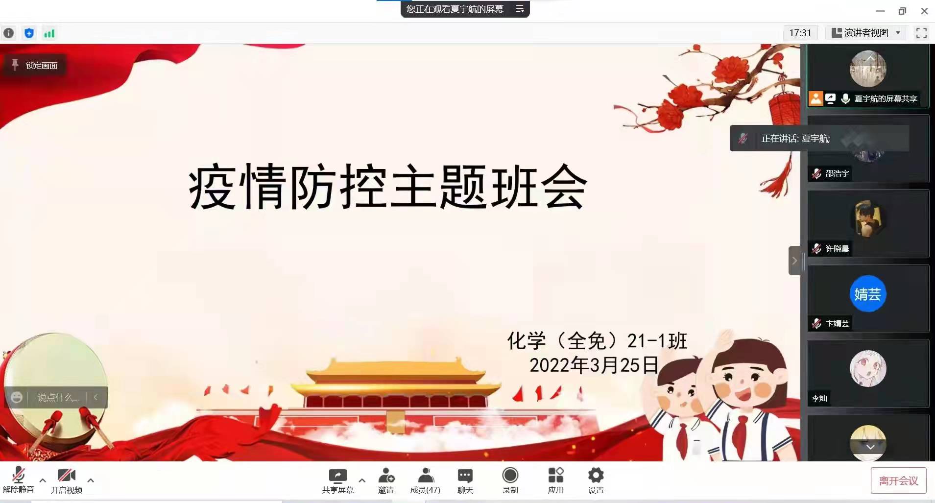 为贯彻落实学校疫情防控工作会议精神,从严从细从实做好学院疫情防控工作,筑牢广大学生疫情防控思想防线,3月25日,麻豆精品㊙️国产传媒AV各年级分别召开了疫情防控线上主题班会,会议由各辅导员、班主任主持。