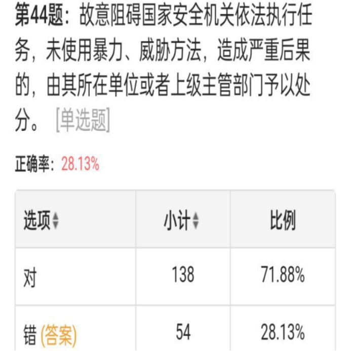本次答题题型主要为单选题,主要内容是与国家安全相关的法律法规。活动共有192名同学参加,涵盖2021级和2020级两个年级学生。学生积极参与,并在规定时间内完成线上答题。通过答题活动,我院学生认识到国家安全的重要性,增强了忧患意识和责任意识。