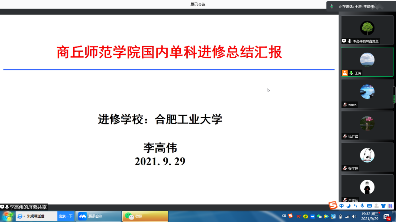 首先,李高伟老师对其2021年春季学期在合肥工业大学单科进修情况及收获进行PPT汇报与交流。汇报重点从进修高校介绍,课程进修的内容,进修的收获等方面进行。接着,各位老师还对李老师进修期间所了解到的合肥工业大学制药工程专业课程开设、课程教学大纲、教学方式方法等方面的情况进行了咨询和交流。最后,王涛指出教师单科进修回校后要强化进修学习效果、学以致用,将所学知识结合我院专业特点进行创新和改进,提升课程与专业建设内涵。