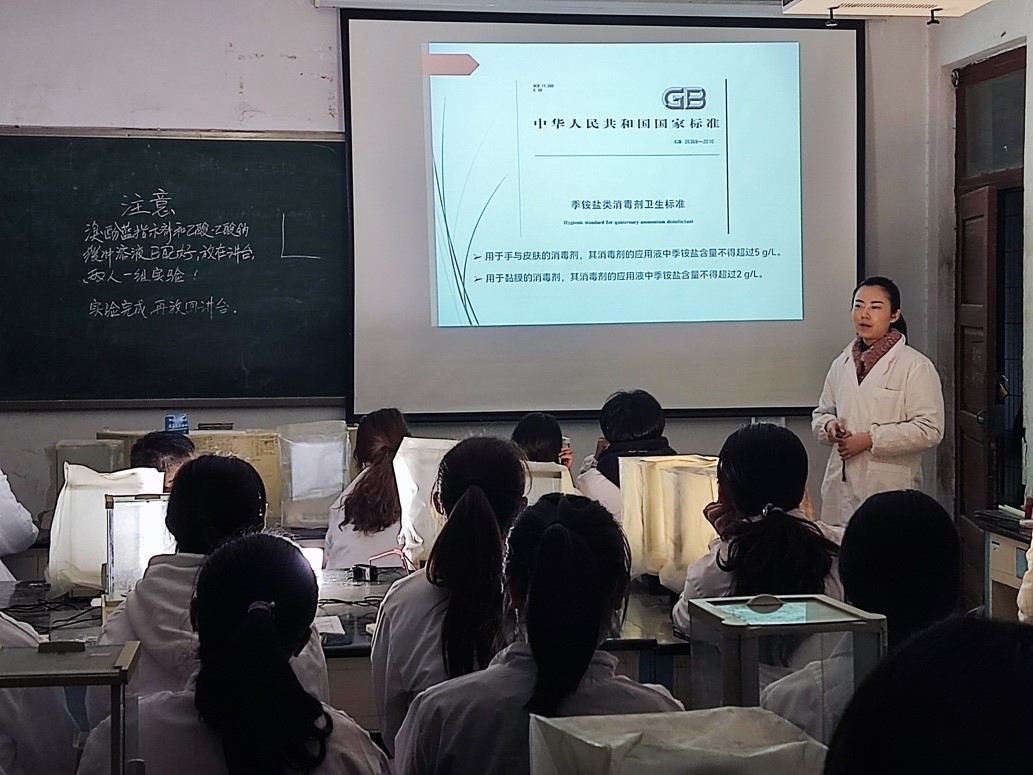 本次公开课的内容是季铵盐类消毒剂的四苯硼钠滴定法。刘老师首先介绍了季铵盐类消毒剂的分类,并将其与最常使用的84消毒剂相对比,明确讲述了季铵盐类消毒剂的优缺点。之后,详细讲解了季铵盐类消毒剂的四苯硼钠滴定法的目的、原理、步骤和注意事项。通过季铵盐类消毒剂的国家标准引导同学们将所学知识用于生活实际样品中的检测,尊重实验数据,树立正确的科研价值观。最后,同学们分组进行实验,老师进行巡回指导,及时纠正学生不规范的实验操作并回答同学们的问题。整个教学设计以学生为主体,合理有序。