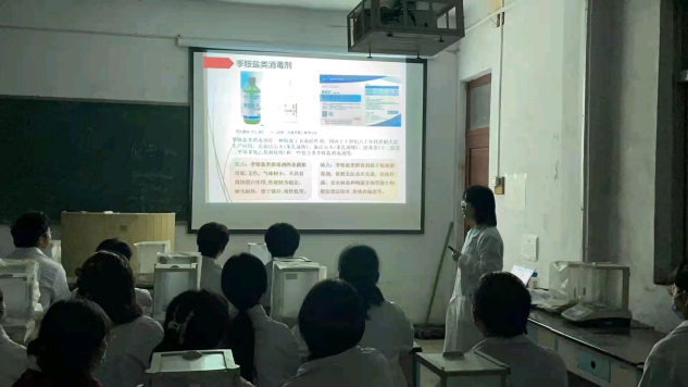 本次公开课的内容是季铵盐类消毒剂的四苯硼钠滴定法。陈老师首先讲述了季铵盐类消毒剂的用途和优缺点。并讲述了根据季铵盐类消毒剂卫生标准,季铵盐在用于手与皮肤和黏膜的消毒剂中的不同含量,把实验与生活相结合,激发同学们的学习兴趣。接下来依次讲述了实验目的、实验原理、主要试剂和仪器,实验步骤,怎么记录数据和实验注意事项等,并根据实验原理,引导学生进行检测,同时教育同学们在实验过程中一定要如实记录实验数据,保证数据的科学性,其贯彻了重结果但更重过程的教育理念。