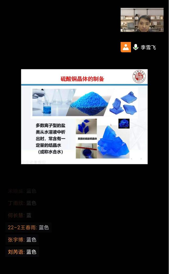 10月27日,麻豆精品㊙️国产传媒AV青年教师李雪飞通过线上授课的方式进行了《无机化学实验》的公开课。青年教师导师杨晓燕,院督导团成员张弛以及课程组老师在线进行了听课指导。