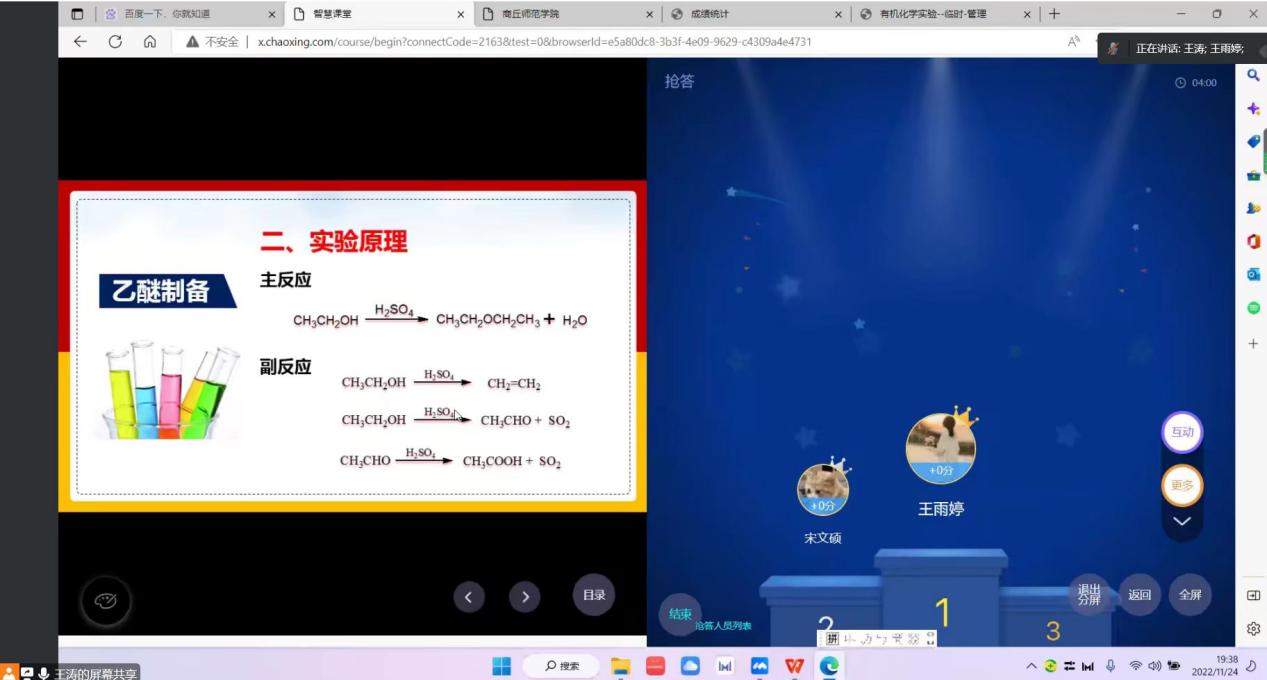 本次公开课王涛老师以乙醚的制备为内容进行课堂讲授。王老师首先介绍了乙醚的发展史、乙醚的应用以及乙醚的危害等相关知识,让同学们对乙醚有了充分的了解,继而提出实验室制备乙醚应该注意哪些问题导入新课。讲授过程中王老师以讲授与提问讨论相结合的方式,利用智慧课堂随机点名、抢答、发布主题讨论等形式带动课堂气氛,带领学生寓教于乐、寓学于乐。另外利用实验演示视频,对乙醚制备过程中的注意事项进行重点讨论,并结合虚拟仿真实验平台带领学生实操训练,充分调动学生上课积极性,提升学生动手操作能力。