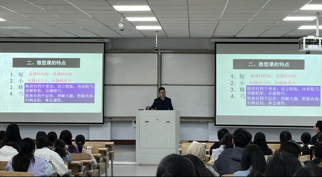 接着吕帅老师进行了《如何上好微型课》的专题讲座。吕老师从什么是微型课,微型课的特点,微型课与说课、微课的区别,如何讲好微型课,微型课要注意的细节等方面进行阐述。并通过播放往年优秀微型课教学案例视频,与同学们一起分析案例中的亮点和不足,加深学生对微型课讲课技巧的理解。