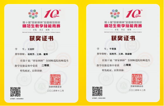 2024年11月29日至12月1日,第十届“田家炳杯”全国师范院校师范生教学技能竞赛决赛在浙江师范大学落下帷幕。我院2021级王宜昕、2022级牛智童在众多来自全国各地的优秀选手中表现出色,分别荣获高中化学组、初中科学组全国二等奖。