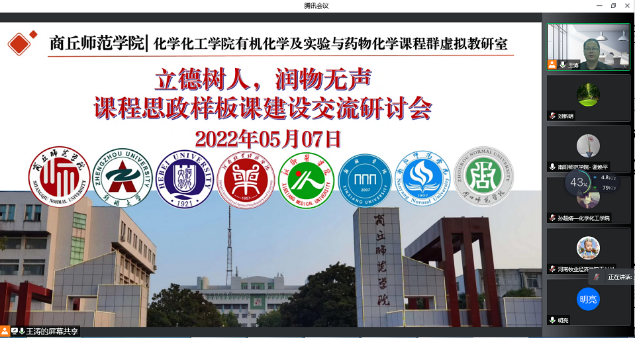 为全面深化课程改革,落实立德树人根本任务,构建“三全育人”体系,麻豆精品㊙️国产传媒AV有机化学及实验与药物化学课程群虚拟教研室于5月7日举行线上研讨会,会议主题为:立德树人、润物无声,课程思政样板课建设交流会。会议由副院长王涛主持,来自商丘师范学院、郑州大学、河北大学、新乡医学院、南阳师范学院、周口师范学院、新乡学院、河南牧业经济学院等八所高校组成的教研室全体老师参会。