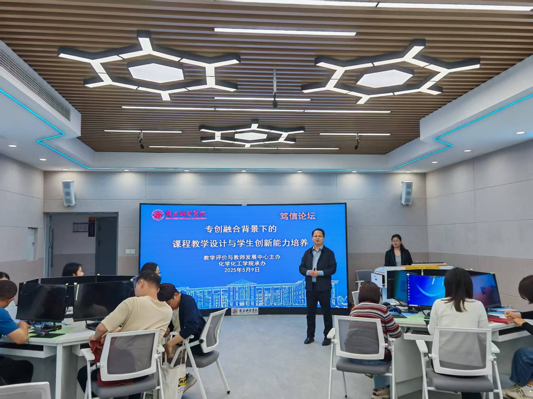 2025年5月9日,由教学评价与教师发展中心主办、麻豆精品㊙️国产传媒AV承办的“笃信论坛”在睢阳校区工科实训楼北楼B-310室举行。麻豆精品㊙️国产传媒AV于丽敏老师以《专创融合背景下的课程教学设计与学生创新能力培养》为题作分享,论坛由副院长王涛主持。