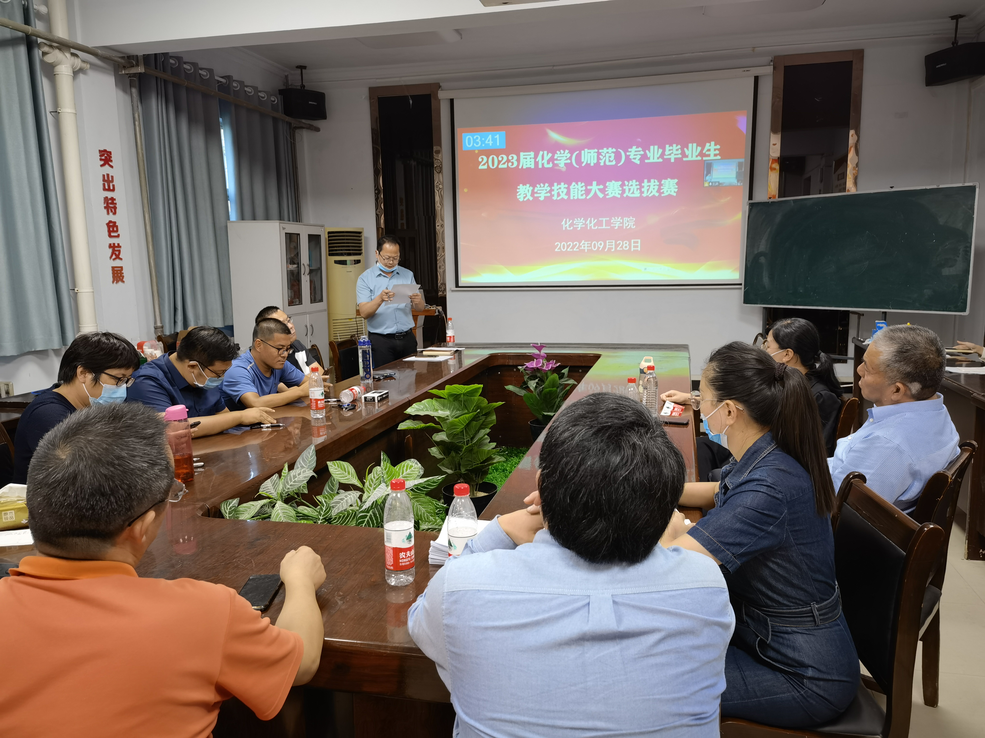 为加强我院化学专业教育实习工作,切实提高化学师范生教学技能,选拔优秀选手参加河南省第二十届师范教育专业毕业生教学技能大赛,学院于9月28日在7号楼103会议室举行了2023届化学(师范)专业毕业生教学技能大赛选拔赛。全体校内教育实习指导老师、参赛选手、化学(全免)师范生参加了本次选拔赛,活动由副院长王涛主持。
