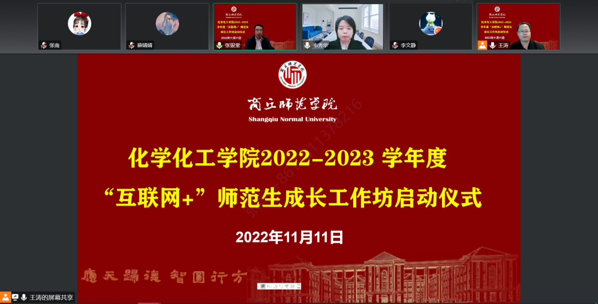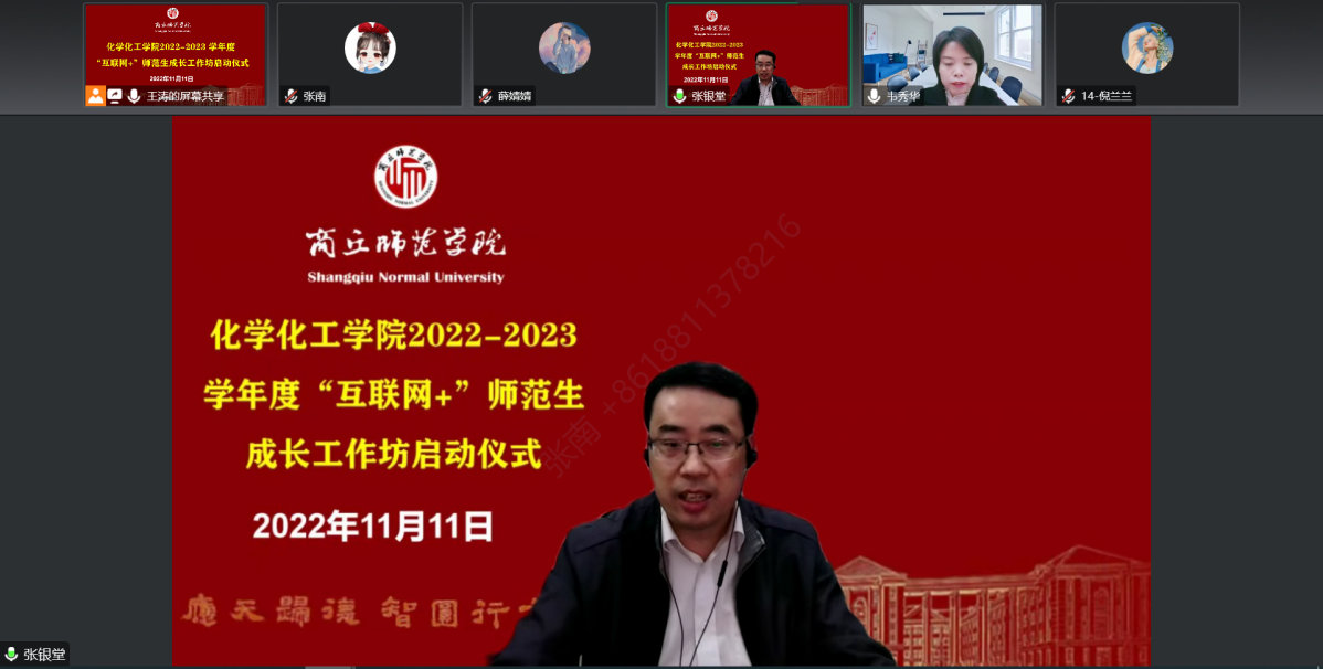 为进一步提升师范生职业素养和专业技能,营造浓厚的师范教育氛围,11月11日晚,麻豆精品㊙️国产传媒AV线上举行了2022-2023学年度“互联网+”师范生成长工作坊启动仪式。来自商丘市教体局基础教育教研室、商丘市第一高级中学、商丘市回民中学、商丘市第一中学、商丘市第六中学、商丘市实验中学的17名中学化学一线名师,麻豆精品㊙️国产传媒AV院长张银堂、副院长王涛、化学系部分老师及2020级全体师范生参加了会议。会议由化学系主任韦秀华主持。